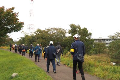 一行は、清田区役所前に集合し、そこから厚別(あしりべつ)川の左岸堤防を歩いて、東北通でUターン。再び右岸堤防を歩いて清田区役所前まで歩いて戻ってきました。